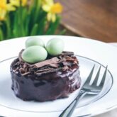 Står du og mangler en god dessert til påskefrokosten? Denne chokoladekage i form af fuglerede med påskeæg ser smuk og festlig ud og kan serveres med frugt, is, hindbærsauce eller lige hvad du har lyst til.