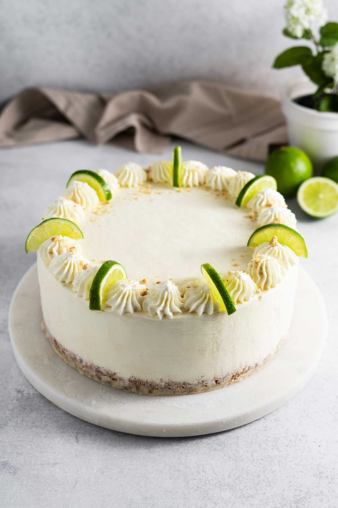 Min mand er vokset op i Florida og siden barndommen har hans yndlingsdessert været key lime pie. Den friske, syrlige limesmag, den sprøde bund og den cremede konsistens er hans ultimative comfort food. Samtidig elsker han også is, året rundt. Så til hans fødselsdagsfest for nyligt besluttede jeg mig for, at jeg måtte kombinere de to i én og samme dessert: nemlig en key lime pie islagkage!